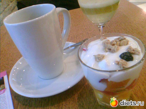 И я заказала себе яблочный фреш, кофе и фруктовый салат с йогуртом, совместив таким образом часть завтрака и перекусы: