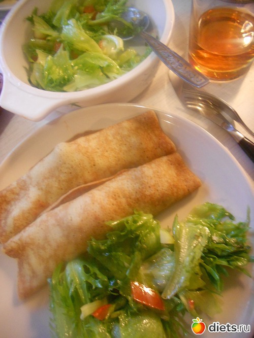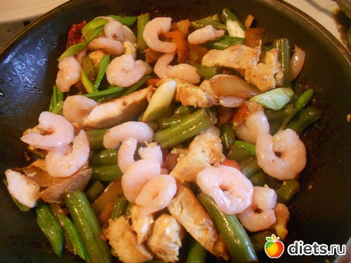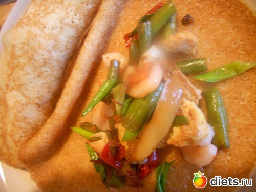 Разогрейте на сковороде 2 ч.л. растительного масла, обжарьте на нем 50 г порезанного кусочками отварного цыпленка без кожи, добавьте мелко порезанный зеленый лук (2 перышка), нарезанный колечками 1 маленький зеленый перчик без семян (как любите: горький или сладкий), обжаривайте 3 минуты. Добавьте 50 г стручковой фасоли, 1 зубчик измельченного чеснока, 2 ч.л. соевого соуса, 2 ч.л. соуса барбекю или кисло-сладкого, 100 г отварных креветок, доведите на среднем огне до готовности. Положите смесь на 4 готовых блинчика, заверните их трубочкой. Подогрейте 1 минуту в микроволновке или на сковороде.