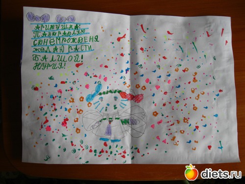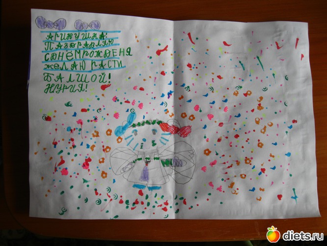 Вчера вечером знатно позанималась на фитнесе, домой пришла в десять, а дети еще не спят, младшая рисовала открытку для подруги на ДР до полдвеннадцатого, а я смотрю, лист с одной стороны чистый, с другой распечатанный, вот сегодня отвела ее в садик и села исправлять косяк, вырезала из журнала красивые картинки и заклеила как Бог на душу положил, попробую приложить сюда.