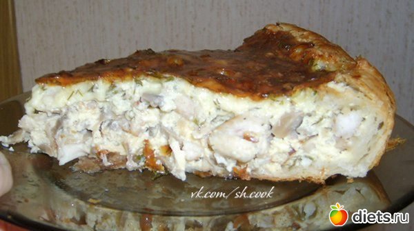 6. Пласт теста (предварительно размороженный, если покупной) раскатываем по размерам формы. Смазываем форму растительным маслом и выкладываем тесто таким образом, чтобы оставались небольшие бортики. Высыпаем на него курицы с грибами. Немного "прессуем".