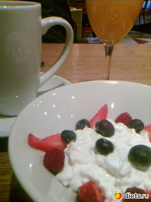 Апельсиновый фреш, кофе, дивный домашний зерненый творожок со свежими ягодами: