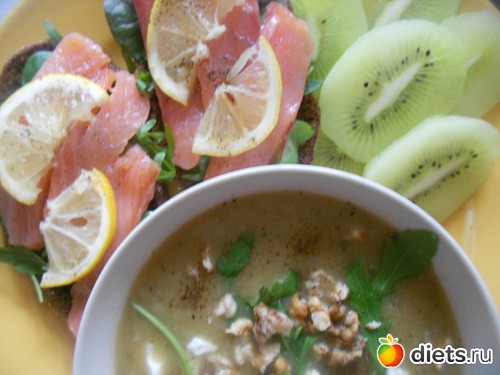 Обед - тот самый суп-пюре из баклажан, полагавшиеся мне ржаные тосты с лососем и салатом, киви: