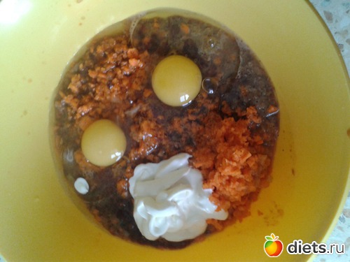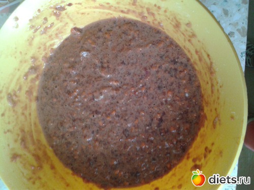 Перемешиваем. Добавляем муку и разрыхлитель, еще раз мешаем.