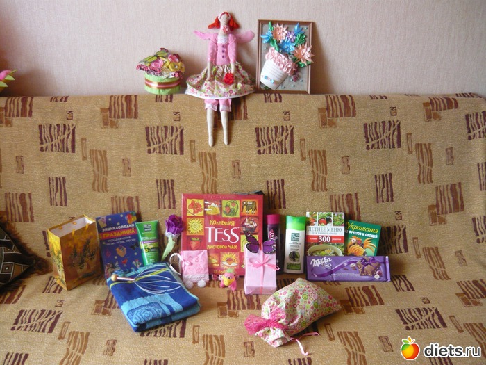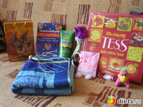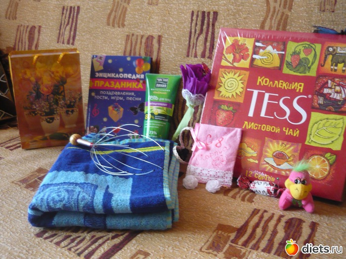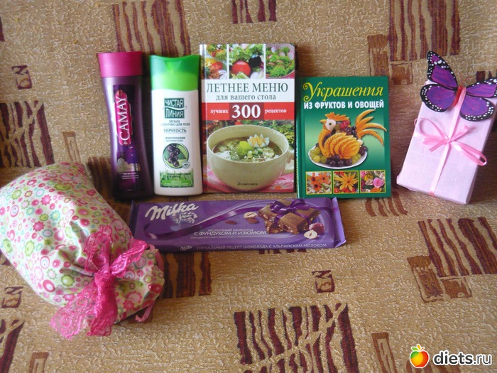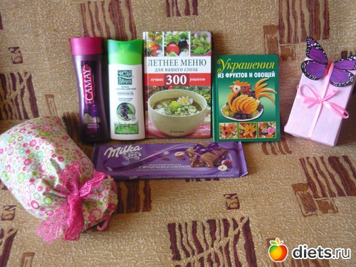 , энциклопедия праздника, полотенце, книга - летнее меню для стола 300 лучших рецептов, книга - украшения из фруктов и овощей, шикарный цветок с конфеткой, лёгкое молочко для тела, гель для душа с пленительным запахом, гель для тела антицеллюлит, милейшего вида дракоша, очаровательные сережки, массажер для головы и аппликация в рамочке с поздравлением