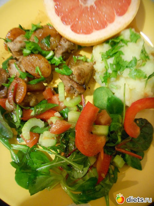 как и было предписано: пряная свинина с курагой, картофельное пюре и салат, на десерт - полгрейпфрута: