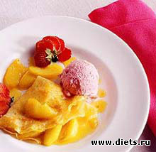 Блины начинить частью персиков, сложить вчетверо и положить в сковороду с остальными персиками. Тушить блины с каждой стороны по 1 мин. Подавать блины, полив сиропом, украсив персиками и шариком клубничного мороженого.