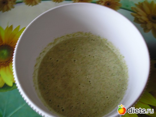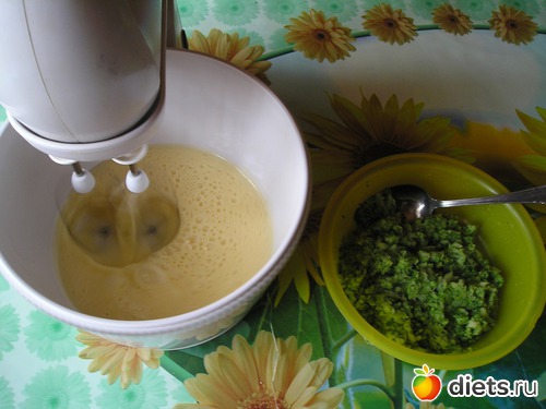 Яйца взобьем миксером с солью, всыпим крахмал, отруби, разрыхлитель, ещё раз взобьем, добавим пюре из брокколи, ещё раз хорошо всё взобьем.