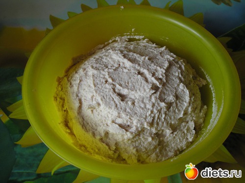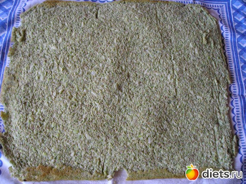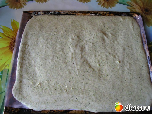 Противень застелим бумагой для выпечки, смажем бумагу растительным маслом, выложим на бумагу тесто в виде прямоугольника, разровняем поверхность и поставим в нагретую до 180 градусов духовку на 20-25 минут.