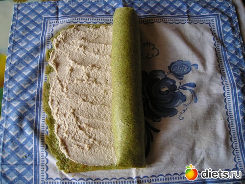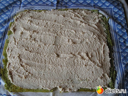 Противень с омлетным тестом вытащим из духовки и выложим на салфетку бумагой вверх.