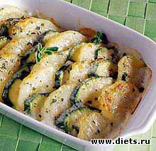 Разложить в форме рядами поочередно картофель и цуккини, посолить и поперчить.