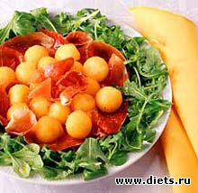Выложить на листья салата шарики дыни, полоски ветчины, полить заправкой. Посыпать салат листиками майорана.