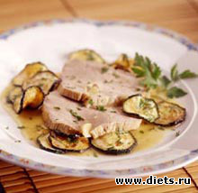 Телятину нарезать ломтиками, выложить на блюдо. Цуккини смешать с соусом и выложить на мясо. Подавать.