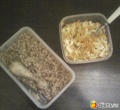 Обедала на работе, по-моему, где то в полпервого дня. Отварная гречка, куриная голень и вчерашний салат. И никаких блин сникерсов с чаем!