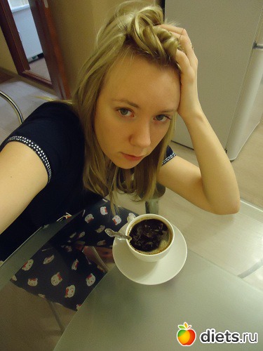 Завтрак... ничего нового: был в полседьмого утра, рисовая каша, чашка яблочного сока, йогурт 0-% с с/з и горсткой мюсли, зелёный чай с 2-мя конфетками. Всё, вроде... Часа через полтора выпила чашку кофе без ничего. Вот ненакрашенная я в пижаме с кофе: