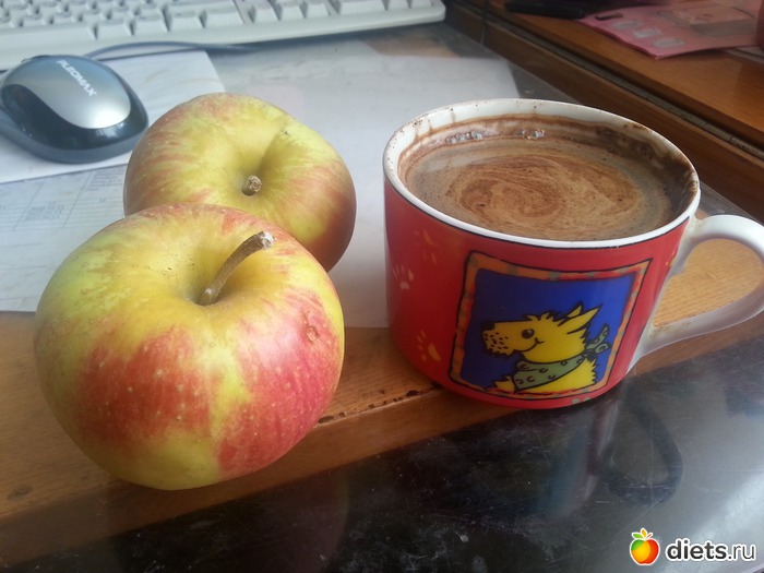 Вот и прошел мой первый денек диеты 90 дней. А начиналось все так хорошо... с утра 2 яблока и кофе. вот так получилось: