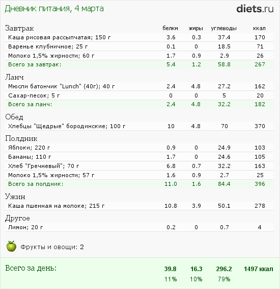 Вчера я углеводов нажрала как слон, зато жиров почти не было. Но 1500 ккал все равно набежало