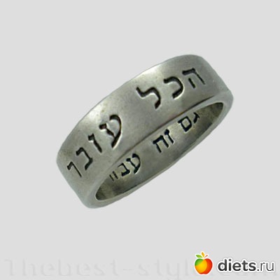 Шло время, Соломон последовал совету Мудреца и обрел спокойствие. Но настал момент и однажды, как обычно, взглянув на кольцо, он не успокоился, а наоборот — еще больше вышел из себя. Он сорвал кольцо с пальца и хотел зашвырнуть его подальше в пруд, но вдруг заметил, что и на внутренней стороне кольца имелась какая-то надпись. Он присмотрелся и прочитал: «И ЭТО ТОЖЕ ПРОЙДЕТ…»