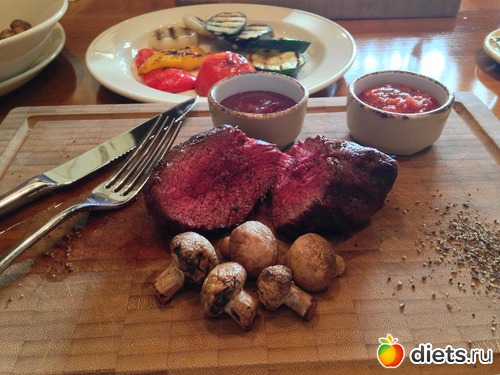 В общем за обед мне почти не стыдно - поскольку в стейке из говяжьего филе уйма белка, 3 гр жиров и 0 углеводов. Плюс я взяла в качестве гарнира шампиньоны на гриле и все это без капли масла! Вполне себе соответствует БУЧ.