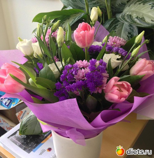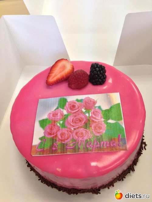 Торт йогуртовый на нежнейшем песочном тончайшем корже с марципановой открыткой. Был буквально разодран между 10 коллегами (включая мою скромную персону) и сожран! Цветы жрать не стали.