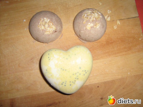 Из этого количества получилось ровно 2 штучки. Завтра буду делать еще. Для сердечка купила жемчужинки для ванны и выложила ими форму, поэтому оно получилось в точечку. У шариков сверху овсяные хлопья. Конечно не совсем то, что я себе представляла, но будем работать над этим вопросом.