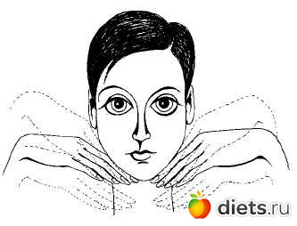 ПОГЛАЖИВАНИЯ нанести на шею обычный рем для лица, в область шеи и начать поглаживать - тыльной староной ладони плавно двигаясь от подбородка к мочкам ушей и так 3 минуты