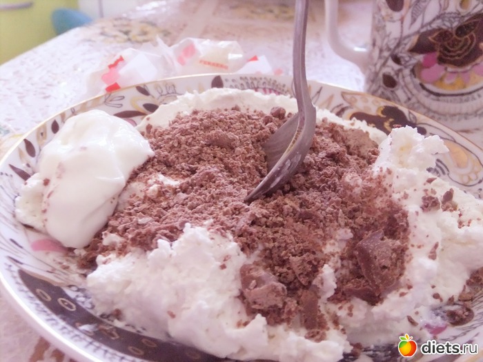 творог обезжиреннный+тертый шоколад (воздушный)+йогурт натуральный+рафаэлки