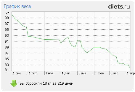 11.02 - Всем привет!!! Я вернулась с отпуска! Не буду врать, что ничего не прибавила, но еще качественно не взвешивалась. Конечно, старалась не сильно нарушать, но ездили большой компанией, очень весело и позитивно, вечерами все равно выпьешь чего-нибудь запрещенного (пивка например) да и закусишь креветочками или еще какой вкуснятиной... В общем, завтра взвешусь, отпишусь. Изменю линеечку на реальный вес и буду строго придерживаться системе! (Я уже со вчерашнего дня не нарушаю!!!)