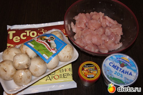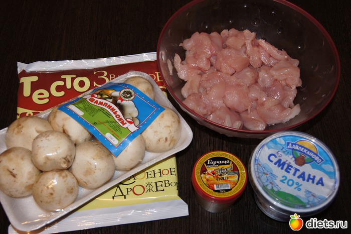 Итак, начинаем: ингредиенты - куриное филе, шампиньоны, тесто слоеное дрожжевое, горчица, сливки (сметана), немного муки, специи.