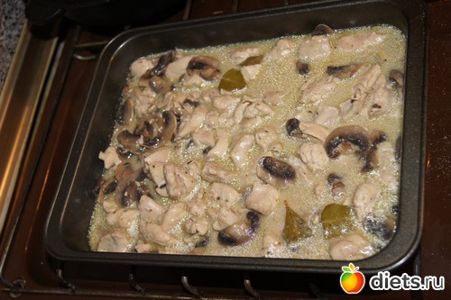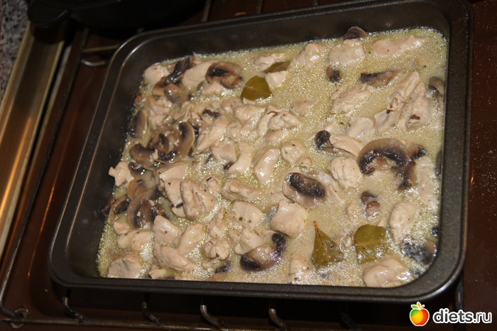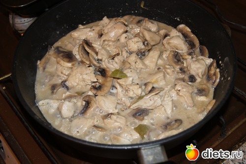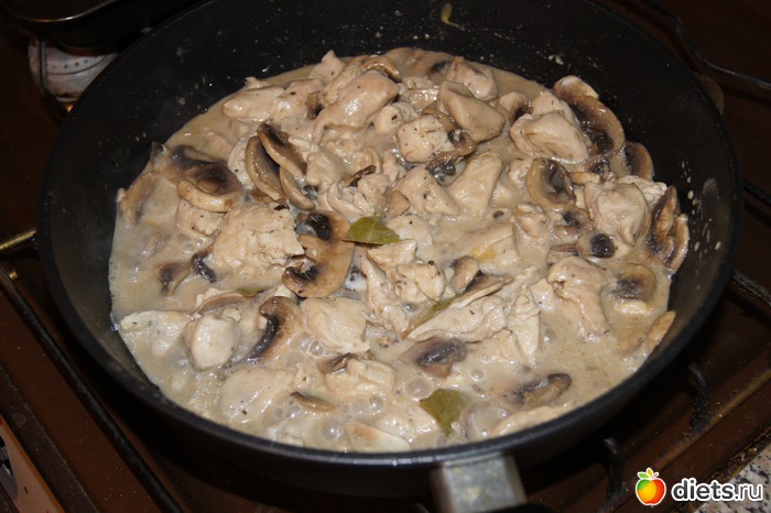 Куриную грудку или филе нарезать на кусочки. В сковородку налить немного раст.масла, положить курицу и поставить на огонь. Посолить, добавить мускат. орех, лавровый лист, тимьян или ваши любимые приправы, кусочек сливочного масла. Зеленый лук покрошить, всыпать в курицу. 150 гр шампиньонов нарезать пластинками - и в курицу. Добавить 1 ст.ложку сливок или сметаны, 1 ч.л. с горкой муки, 1 ч.л. с горкой горчицы. Влить 300 мл куриного бульона (или овощного, или просто воды). Уменьшить нагрев, немного потушить.