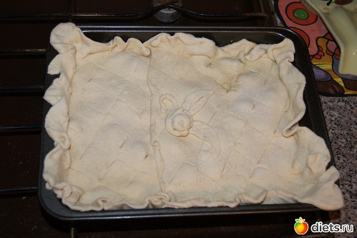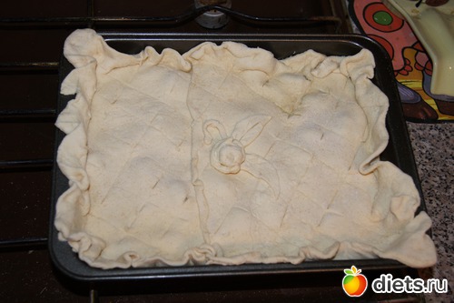 Слоеное тесто разложить сверху на курицу, слегка надрезать (решеткой).