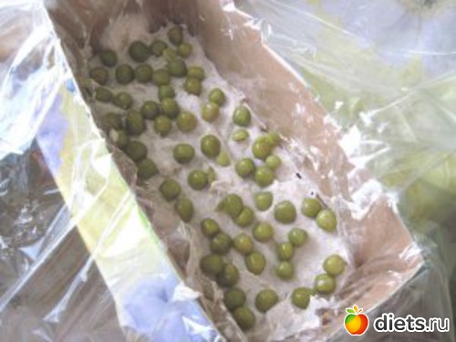 6. Форму выложить пищевой пленкой (по бокам должна свисать, чтобы потом можно было накрыть сверху), положить слой массы с паприкой, потом половину горошка, сверху слой массы. Повторяем все также только с частью массы с хмели-сунели.