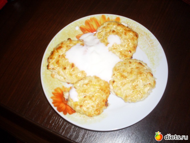 В творог добавить белок , яблоки и корицу , сформировать ложкой и на пергаментную бумагу, сверху смазать желтком)) из-за желтка, наверное, такой цвет)))