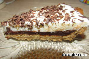 В это время растопить 160 гр. шоколада, добавить ст. л. сливочного масла и ст. л. сметаны, а также ст. л. сахара. Горячий шоколад вылить на основу, дать остыть.
