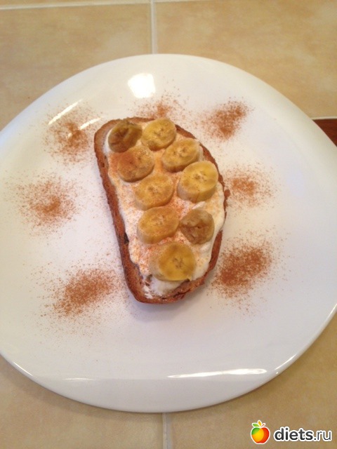 150 гр обезжиренного творога смешиваем с 1 чайной ложкой жидкого меда, выкладываем его на кусок зернового или серого хлеба, можно сделать типа тоста на сухой сковороде, а в моем случае это был кусок хлеба из гречневой муки, сверху на творог кладем порезанный на кружочки банан и посыпаем корицей...готово!