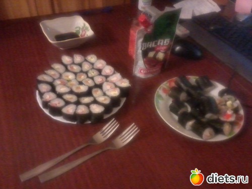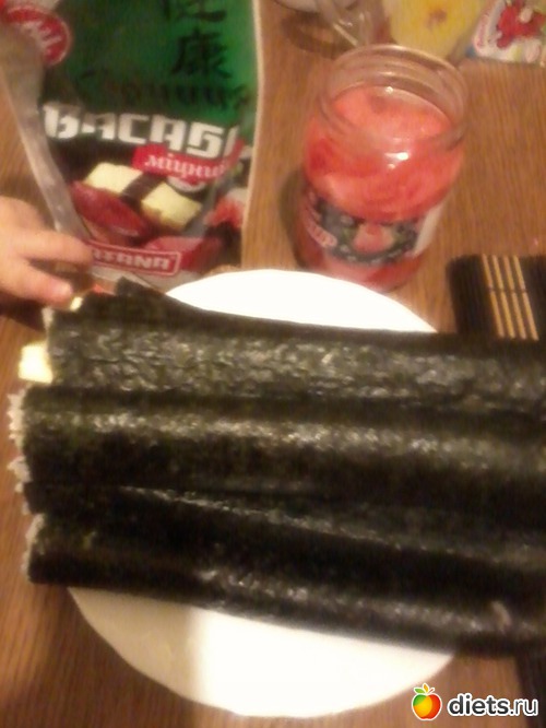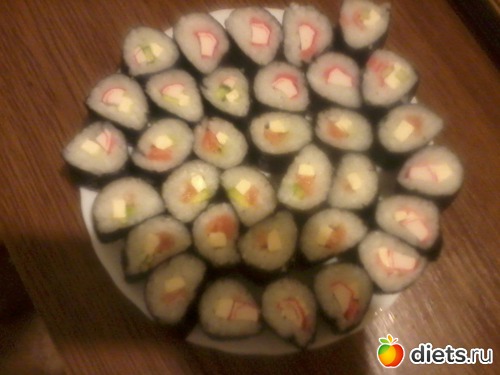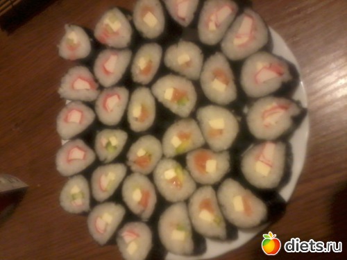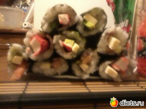 начинкой были:красная рыба(сама солила), крабовые палочки, плавленные сырки, огурец, авокадо, ну и имбирь в некоторые ложила.закончила лепить в 22:30
