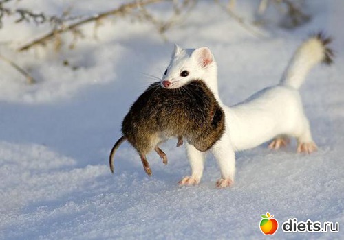 Белочка, засыпанная снегом-умиляет))) такие глазки, ооох)) И совята шкодные!! А вот белая горностайка бегает у меня под окнами, видимо, с гор прибежала, пообедать))