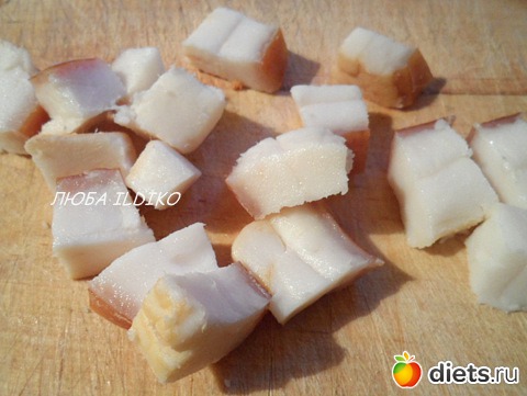 Сало порезать на кубики и вытопить на сковороде, шкварки достать. Я люблю шкварки с кожицей, а желающие могут её заранее срезать.