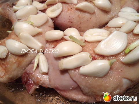 В противень или другую посуду для духовки выложить куриное мясо. Посолить, посыпать паприкой. Она придаст потом мясу и будущему соусу красивый цвет. Чеснок весь очистить, каждую дольку разрезать пополам и разложить сверху по мясу.