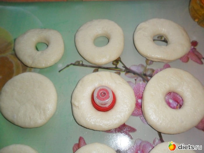 Затем раскатываем тесто толщиной 1,0-1,5 см и вырезаем стаканом или чашкой кружочки, а в них - дырочки с помощью пробки от пласт.бутылки: