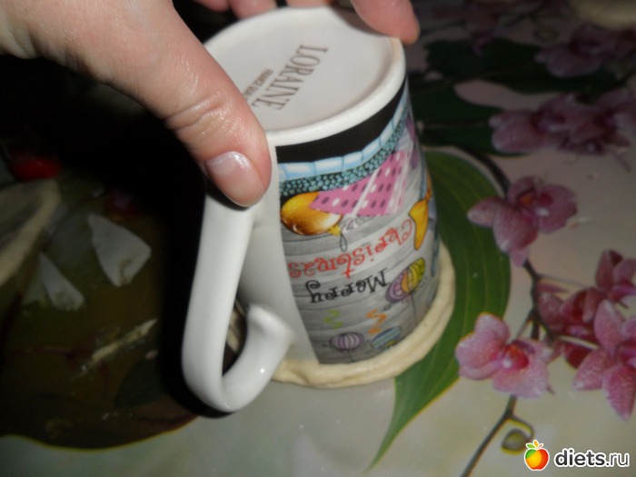 с помощью чашки вырезаем пончик. Лишние края убираем и откладываем в сторону.