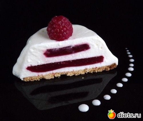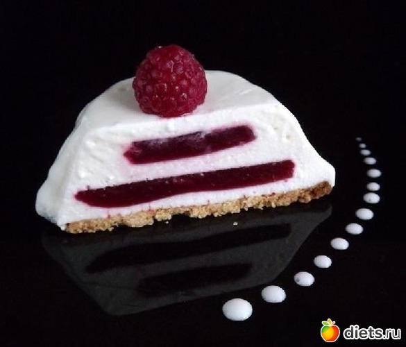 10. Готовый десерт перед подачей нужно извлечь из формы. Для этого в глубокую миску наливаем горячую воду и опускаем формочку на секунд 20. Потом переворачиваем форму на песочную основу. Оформляем ягодами.