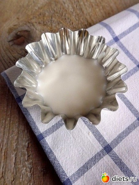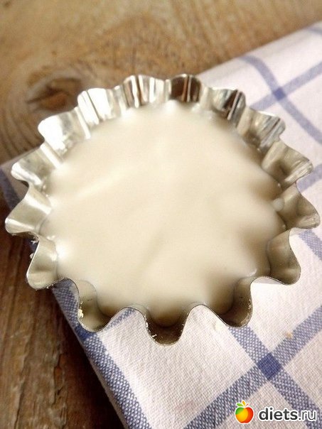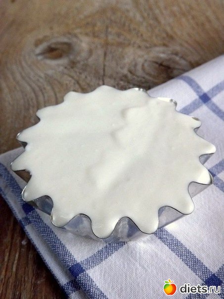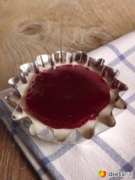 8. Приступаем к сборке. В формочку кладем немного творожного крема. Ставим в холодильник на минут 15. Крем схватывается быстро. Теперь на него кладем кружок ягодного желе, меньший по диаметру нашей формы.