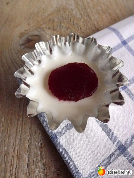 2. Соединяем ягодное пюре и растворенный желатин. Выливаем в форму. Форму выбираем такую, чтобы слой получился около 7 мм. Оставляем застывать.