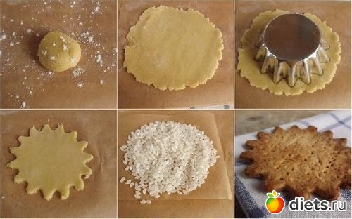 5. Теперь накалываем основу вилкой и на каждый кусок кладем пергаментную бумагу, а сверху посыпаем рисом для того, чтобы основа получилась ровная. Выпекаем при 200С минут 10. Потом еще пару минут уже без риса. Даем полностью остыть.