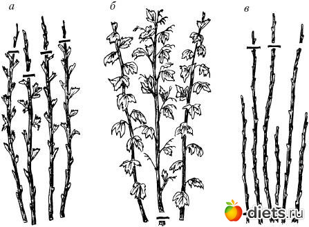 pobegi perezimovavshiye i molodiye (novogo goda) - obrezat’ do zhivjh pochek (na 10-15 sm) (ris.a), vse plohie na vid, suhiye, bolniye, slomanniye pobegi - obrezat’ (do zemli) - kak na risunke. PROREDIT’, ostaviv tolko samie silnie na vid. Na 1 pogonnij metr dostatochno 10-12 2-hletnih pobegov. Ne zhalej - malina lubit prostor. Osen’yu, posle plodonosheniya - obrezhte otplodonosivshie pobegi do zemli. Snova virezhte vse bolniye i povrezhdenniye pobegi i sozhgite ih - chtobi zarazu ne raznosit’