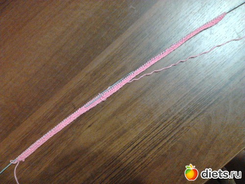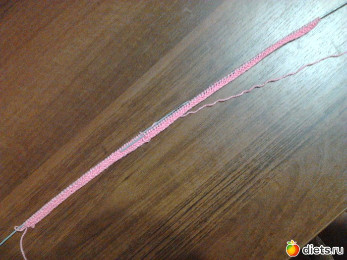 Через 29см начть убавление. Провязываем 12п. потом по две петли вместе, последние 12п. провязываем обычно., вяжем два ряда, а затем ряд отверстий для ленточки.(*2лиц.,2п.вместе лиц., 1накид*, *повторить от*,2лиц.