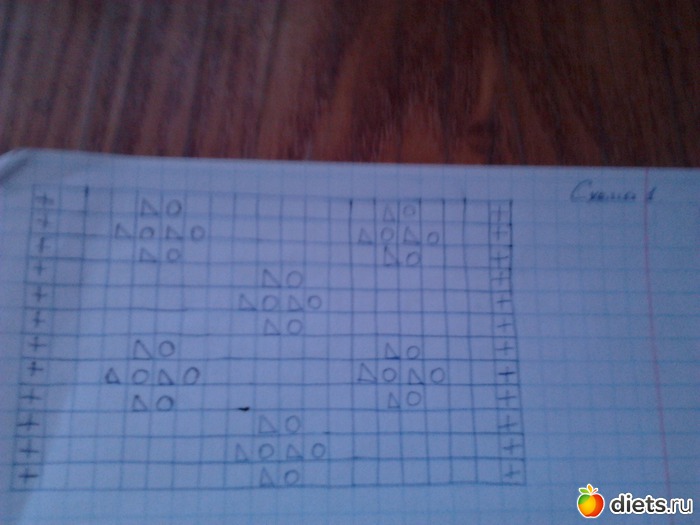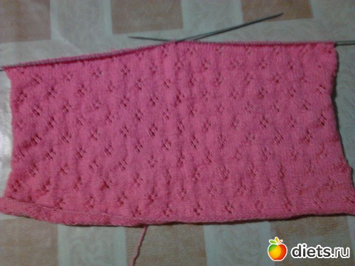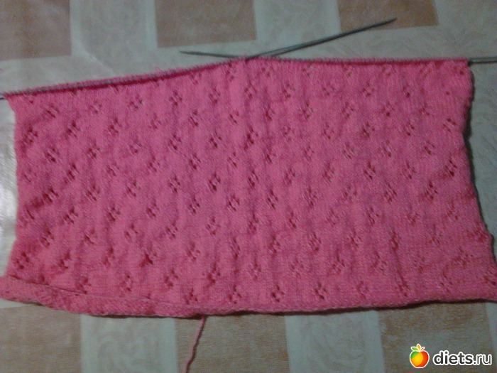 Переднюю часть вяжем узором по схеме 2.. По бокам делаем такие же убавки. Через 8см. от начала узора, закрываем средние 3 петли и вяже по отдельности. С внутренней стороны убавляем по 1-ой петле в каждом 2-ом ряду, пока не убавим 6 петель.через 5см. от выреза горловины закрываем. вторую половину вяжем аналогично.