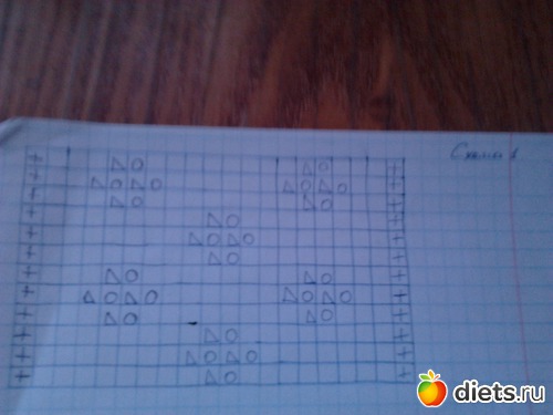 связать 4 р. платочной вязкой(лиц. и изн.р. - лиц.п.) и продолжаем узором по схеме 1.