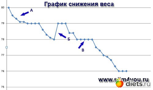 Вы удивлены тем, что он выглядит так волнообразно? На самом деле именно так и протекает нормальный, физиологически правильный и безопасный процесс снижения веса. В нем должны быть периоды, когда вес снижается (А), точки роста веса (Б), периоды, когда вес замирает на одной точке (В).