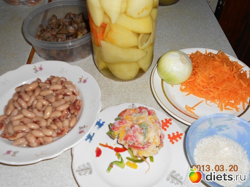 Фасоль перемолоть на мясорубке или в измельчителе и смешать с рисом и тушеными овощами. Поперчить, посолить и добавить яйцо. Фарш хорошо вымесить.